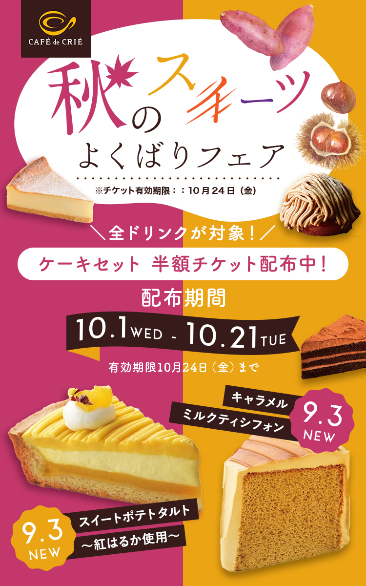 上記の「ケーキセット半額チケットダウンロード」ボタンを押してチケットをGET!