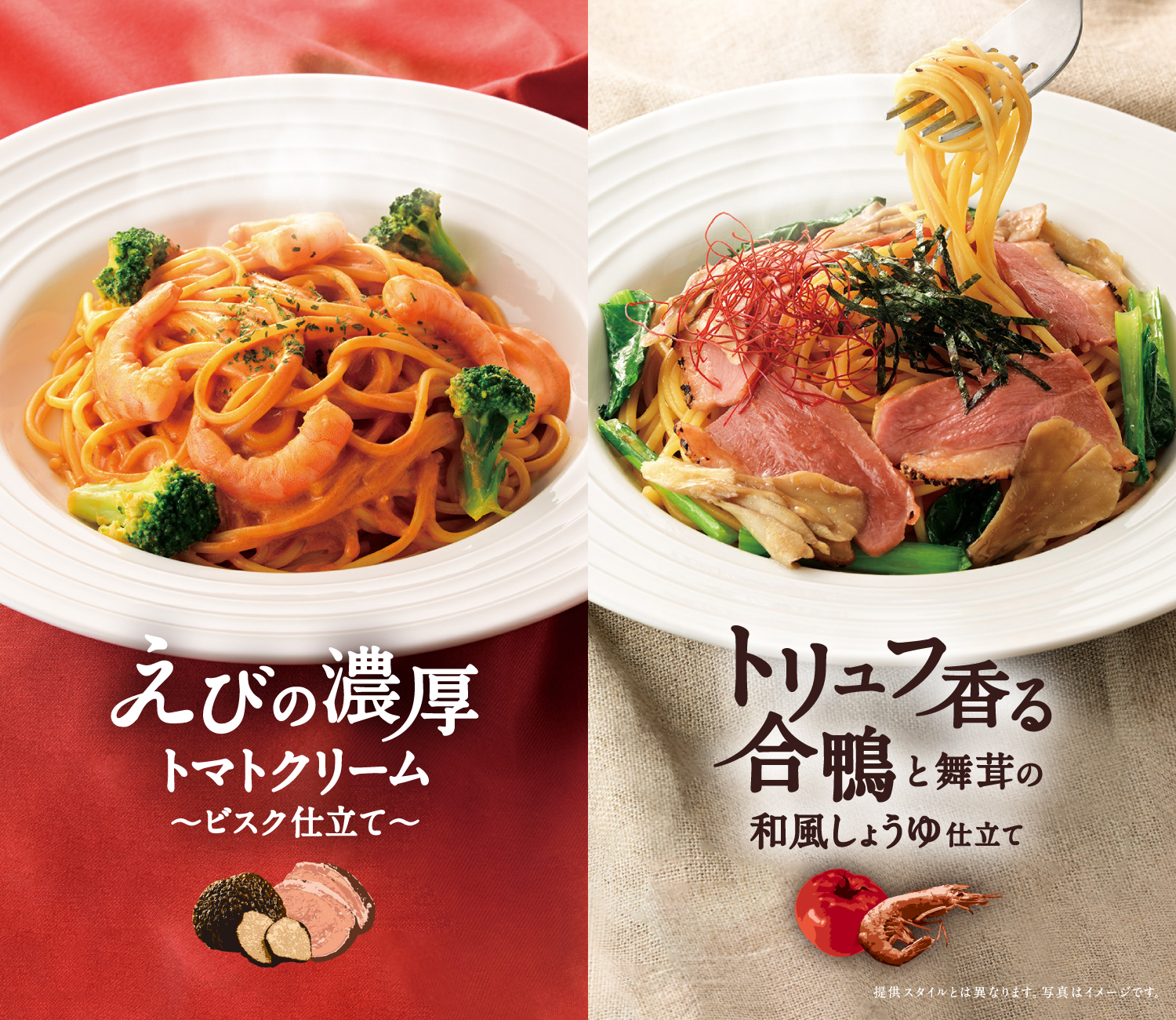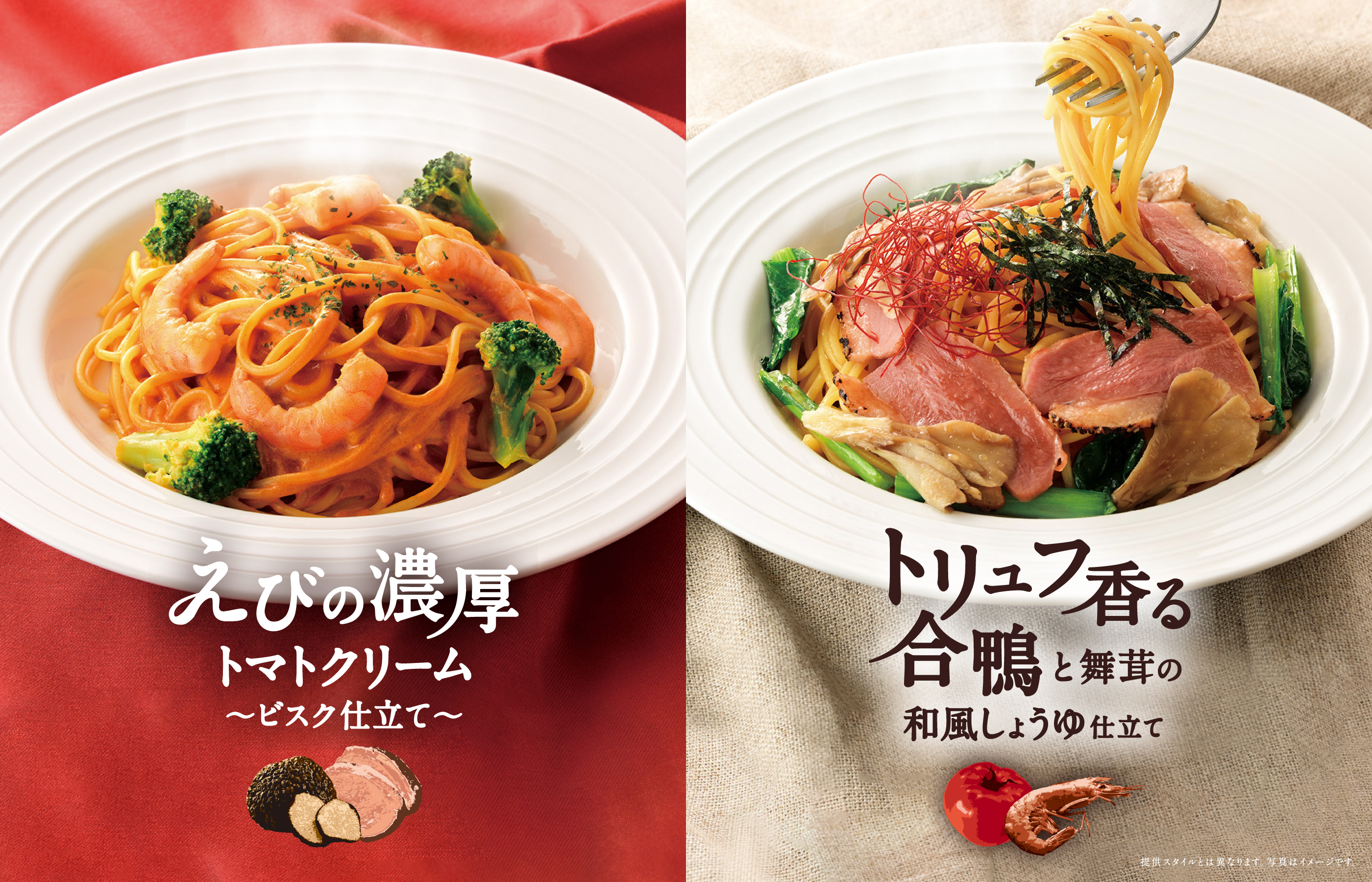 トリュフ香る合鴨と舞茸の和風しょうゆ仕立てえびの濃厚トマトクリーム~ビスク仕立て~